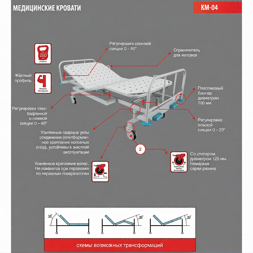 Медицинская кровать КМ-04 - функциональная медицинская кровать с механической регулировкой секций. Предназначена для ухода, диагностики, лечения и наблюдения за пациентом в стационарных медицинских учреждениях, и в домашних условиях