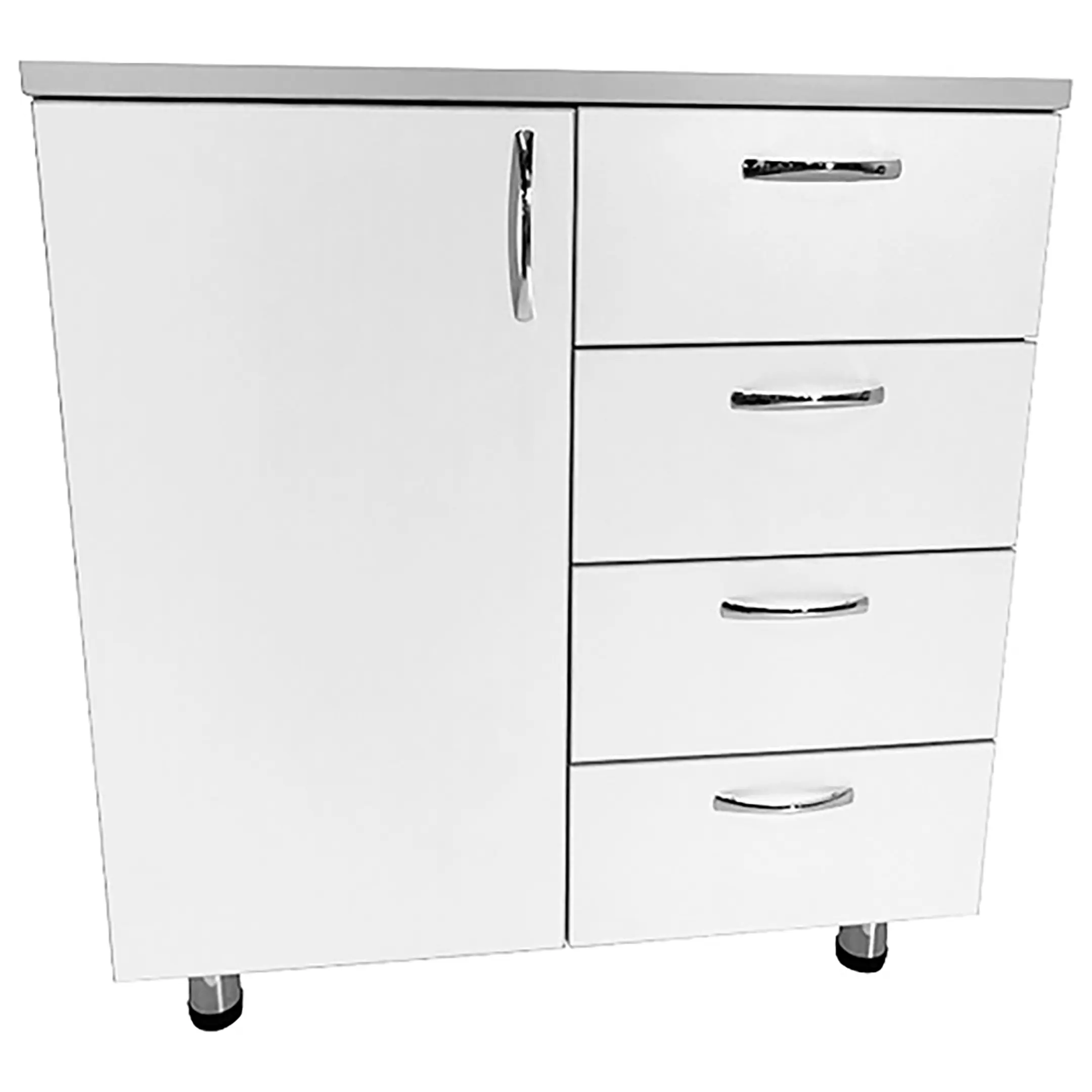 • Хромированные ручки-скобы размером 96 мм (5 шт.) обеспечивают удобство открытия и закрытия ящиков, а кромка ПВХ 2 мм для столешницы и 0,4 мм для других частей гарантируют безопасность и долговечность изделия.