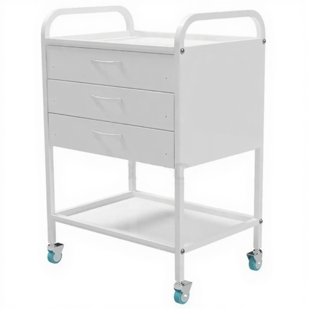 Стол медицинский инструментальный СМИ-02-03 (полки металл, колёса серая резина) — это передвижная тумба, предназначенная для размещения инструмента, лекарственных препаратов и приборов в медицинских учреждениях и лабораториях. Модель имеет каркас из профильной стальной трубы, три выдвижных ящика и верхнюю полку из металла.