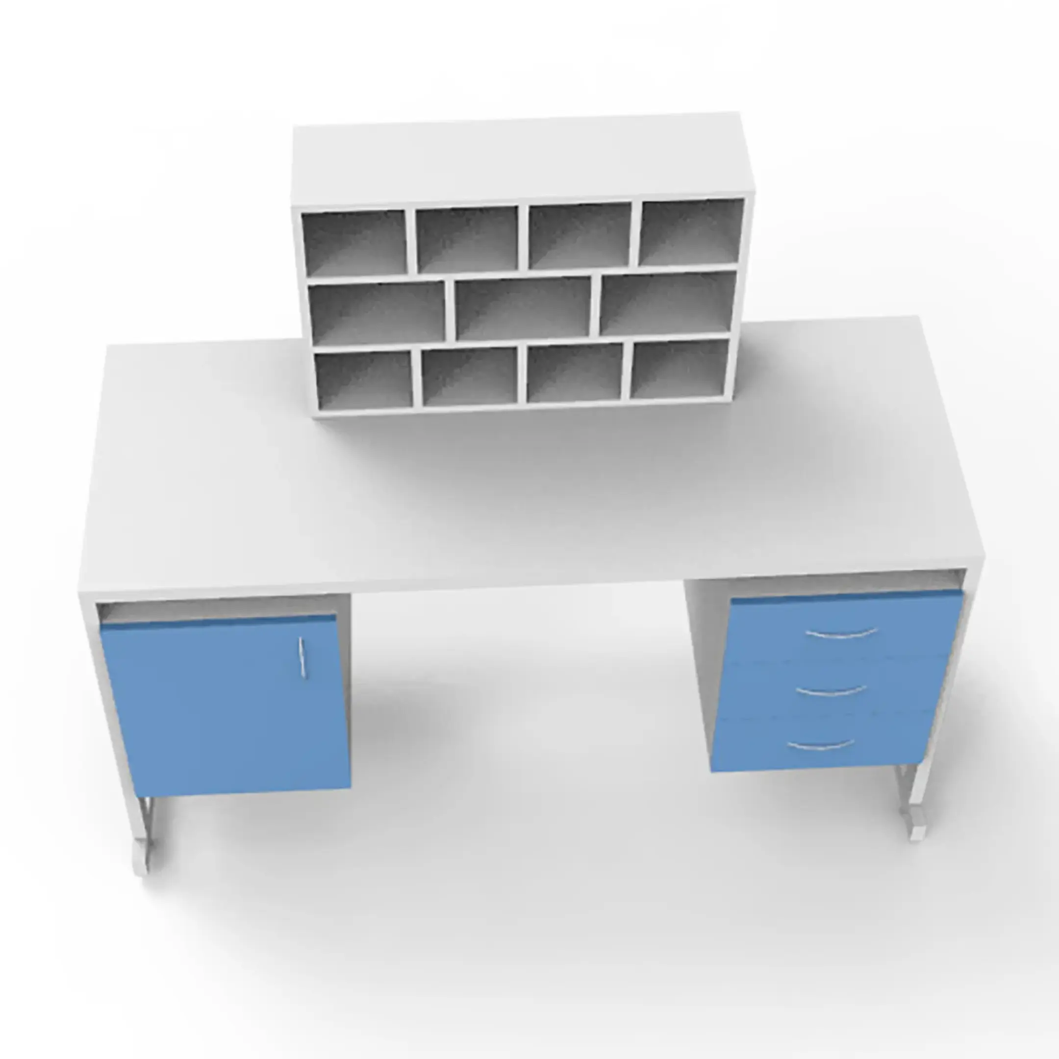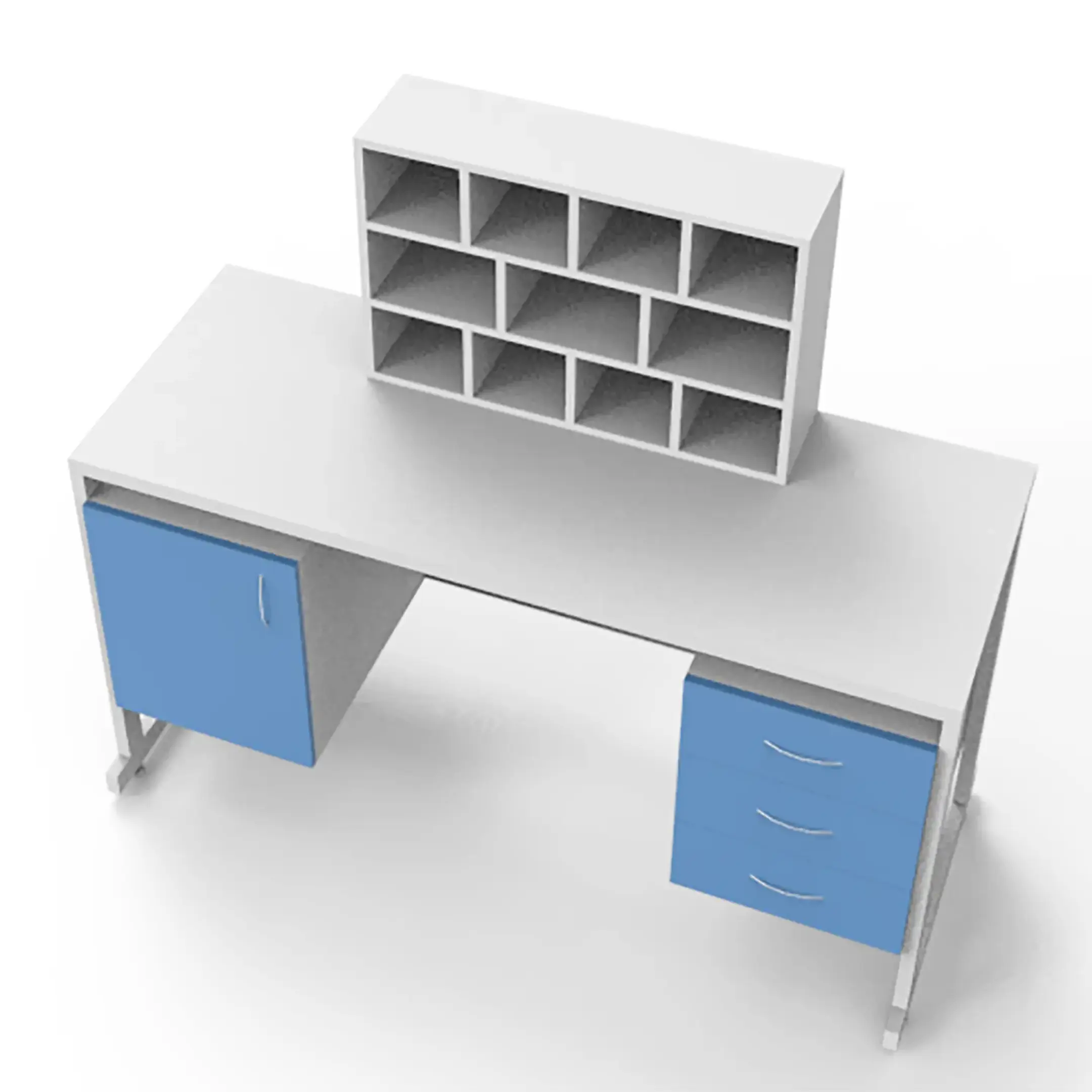 - Удобное хранение — две боковые тумбы: левая с дверцей и правая с тремя выдвижными ящиками для размещения материалов и инструментов.