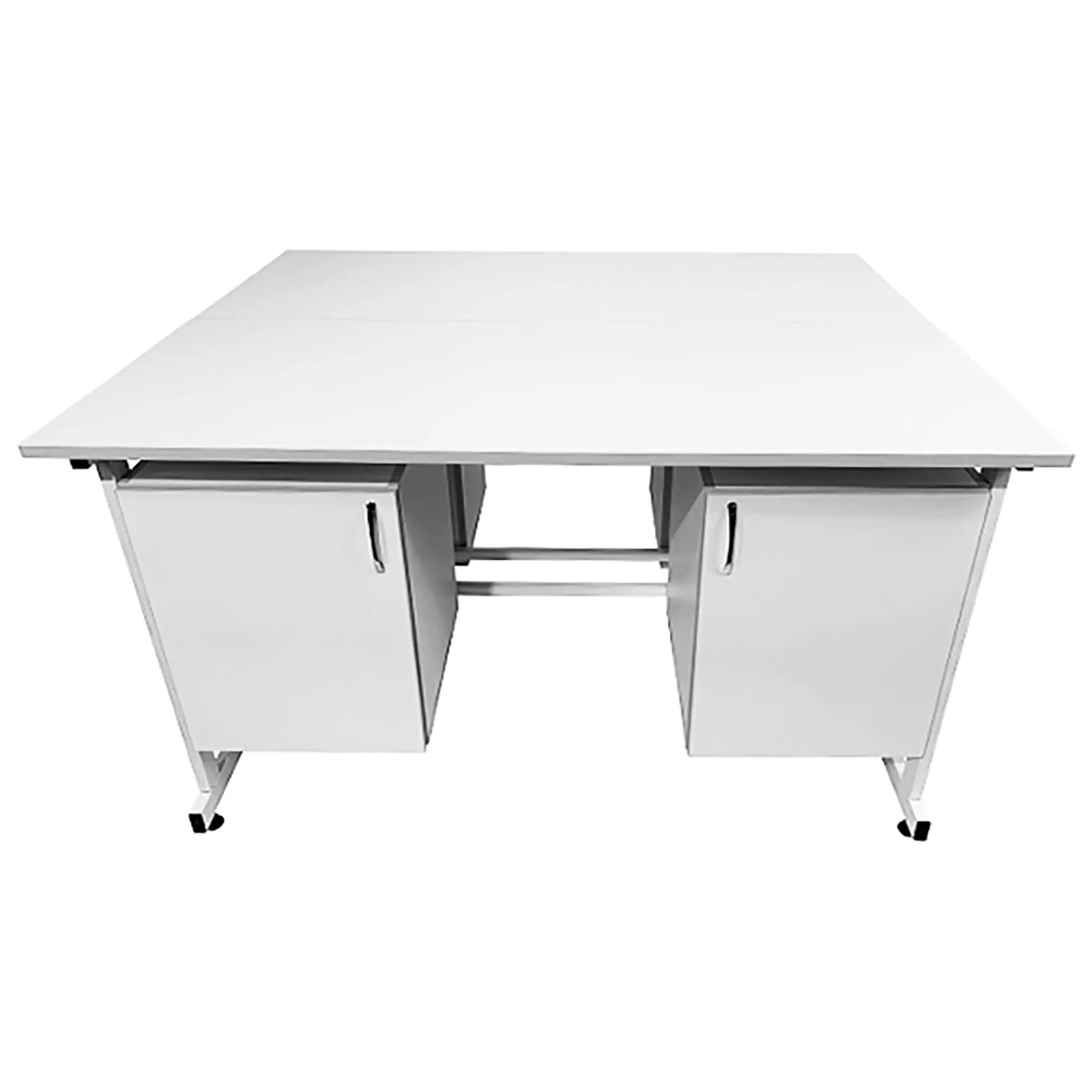 Стол лабораторный островной Сло 22.004 (белый) — это оптимальное решение для организации двух рабочих мест в лабораториях и медицинских учреждениях, способствующее рациональному использованию доступного пространства. Модель оснащена двумя рабочими местами, каждое с двумя подвесными тумбами с распашными дверками и полками. Каркас выполнен из стального профиля, столешницы из ЛДСП толщиной 22 мм.