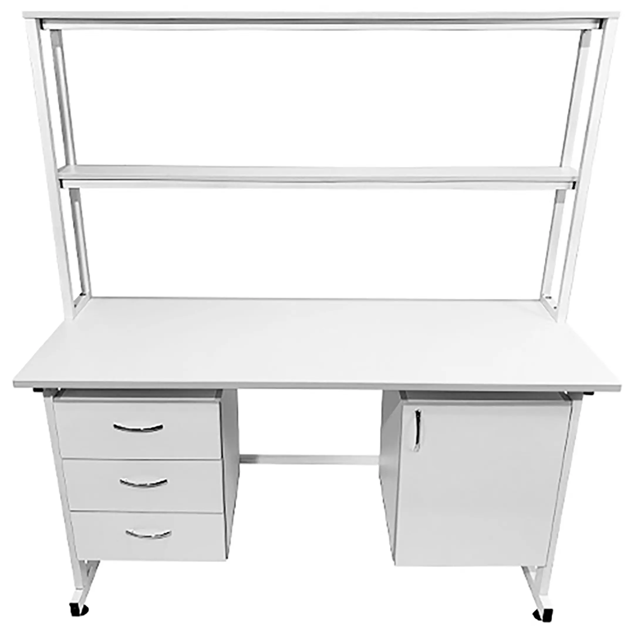 Стол лабораторный с надстройкой СЛн 16.016 (белый) — это идеальное решение для организации эффективного и комфортного рабочего места лаборанта, занятого проведением химических исследований в лабораториях и медицинских учреждениях. Модель оснащена подвесными тумбами: слева с тремя выдвижными ящиками, справа с распашной дверкой и полкой, надстройкой с двумя полками и металлическим защитным экраном. Каркас выполнен из стального профиля, столешница из ЛДСП толщиной 22 мм.
