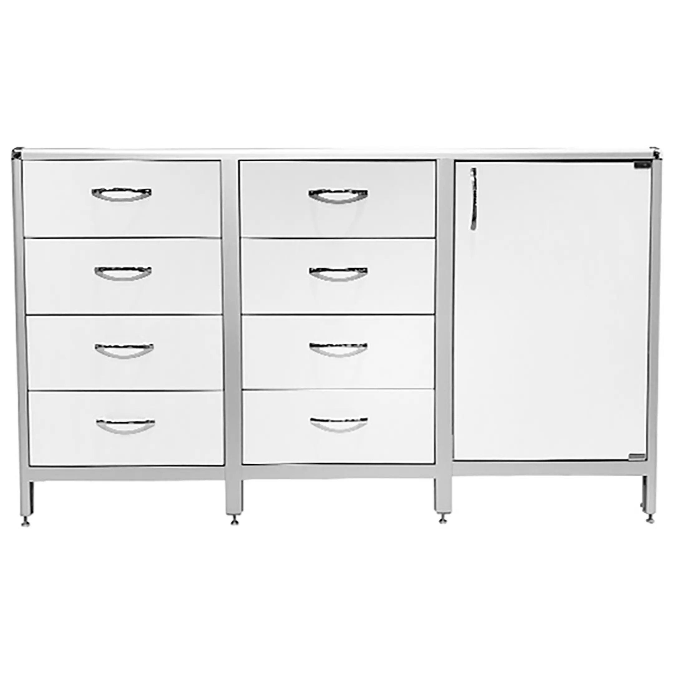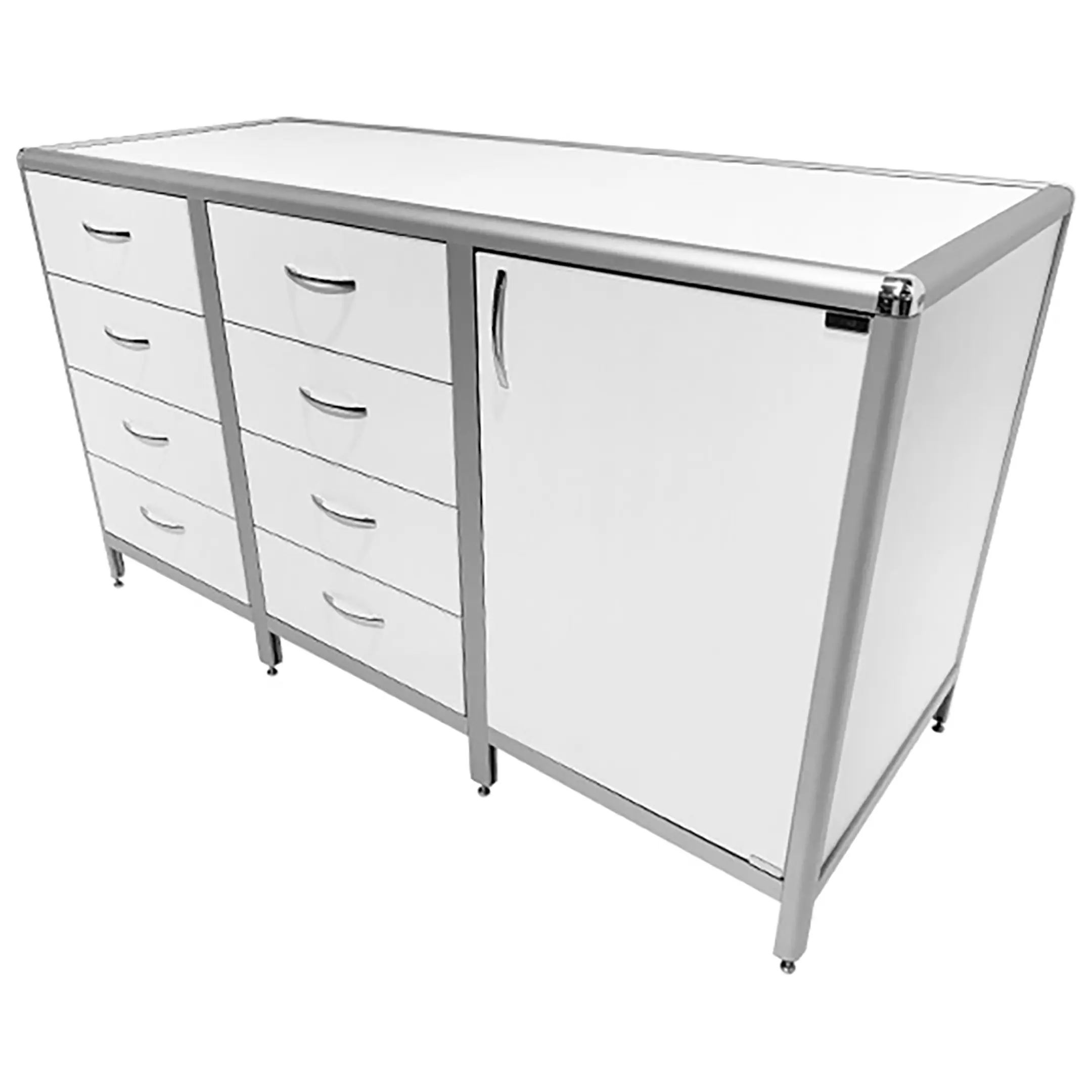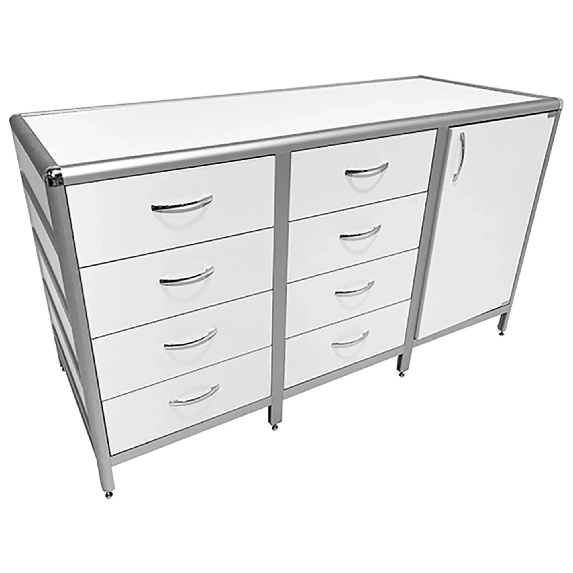 Стол-тумба лабораторная MED 12.022al (белый) — это функциональное решение для хранения лабораторного инвентаря, приборов и материалов в лабораториях и медицинских учреждениях. Модель разделена на три отдела: один с распашной дверкой и полкой, два других с восемью выдвижными ящиками. Каркас выполнен из алюминиевого профиля, столешница из ЛДСП толщиной 16 мм.