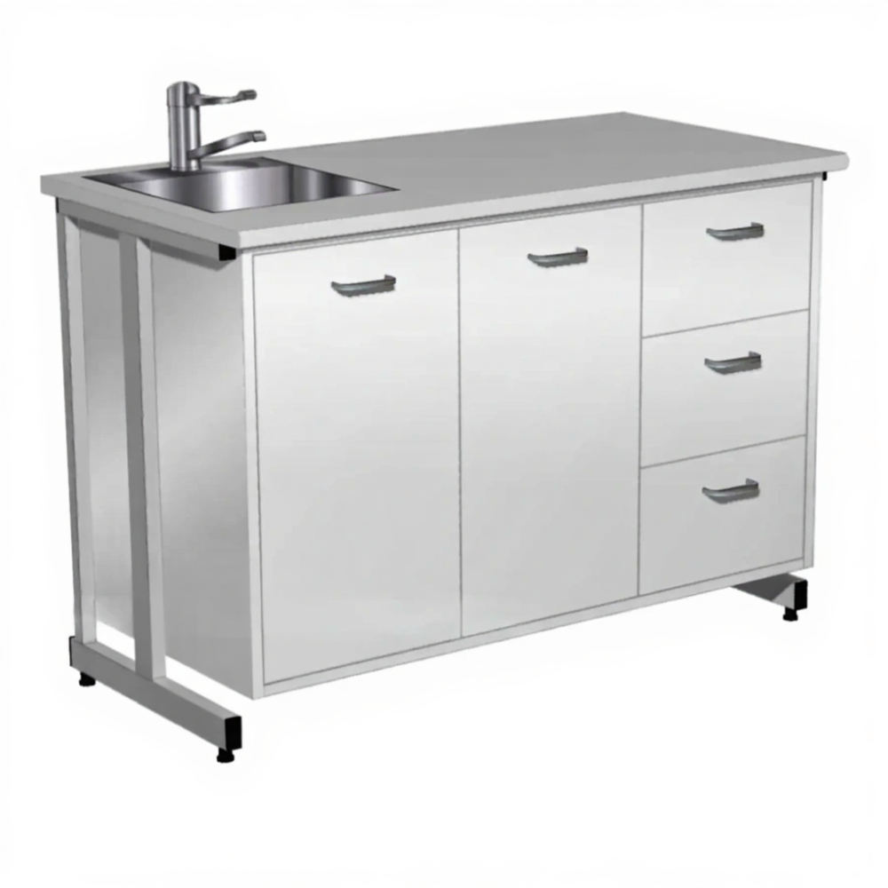 Стол-мойка СТм-208 «Премиум» 1200 (корпус металл серый, столешница постформинг серый, каркас серый) — это необходимая составляющая для оснащения рабочей зоны, обеспечивающая удобство и безопасность труда специалистов-исследователей в кабинетах лабораторий. Модель предназначена для мытья и сушки лабораторной посуды. Оснащена одночашевой врезной мойкой из нержавеющей стали глубиной 250 мм, локтевым смесителем и комбинированной системой хранения: в левой секции две дверки, в правой — три выдвижных ящика на шариковых направляющих. Каркас выполнен из стального профиля, корпус из стального листа с полимерно-порошковым покрытием, столешница из постформинга 26 мм.