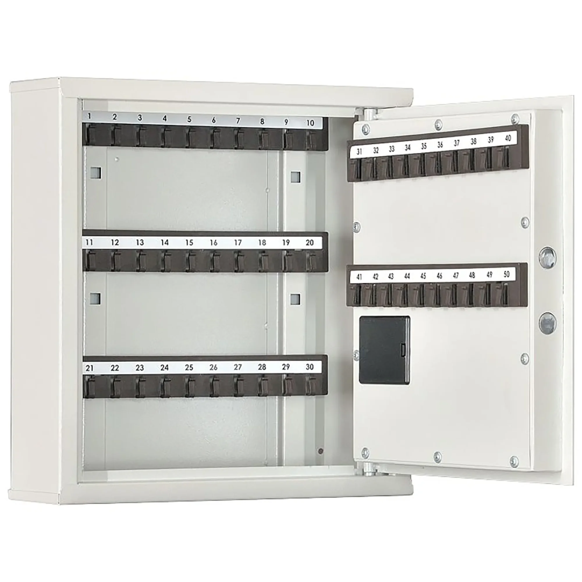 - Компактная вместимость для подразделений и точек контроля — система предназначена для хранения до 50 комплектов ключей, что идеально подходит для организации хранения ключей в конкретном отделе, на посту охраны или в диспетчерской, где требуется порядок и контроль за ограниченным количеством ключей.