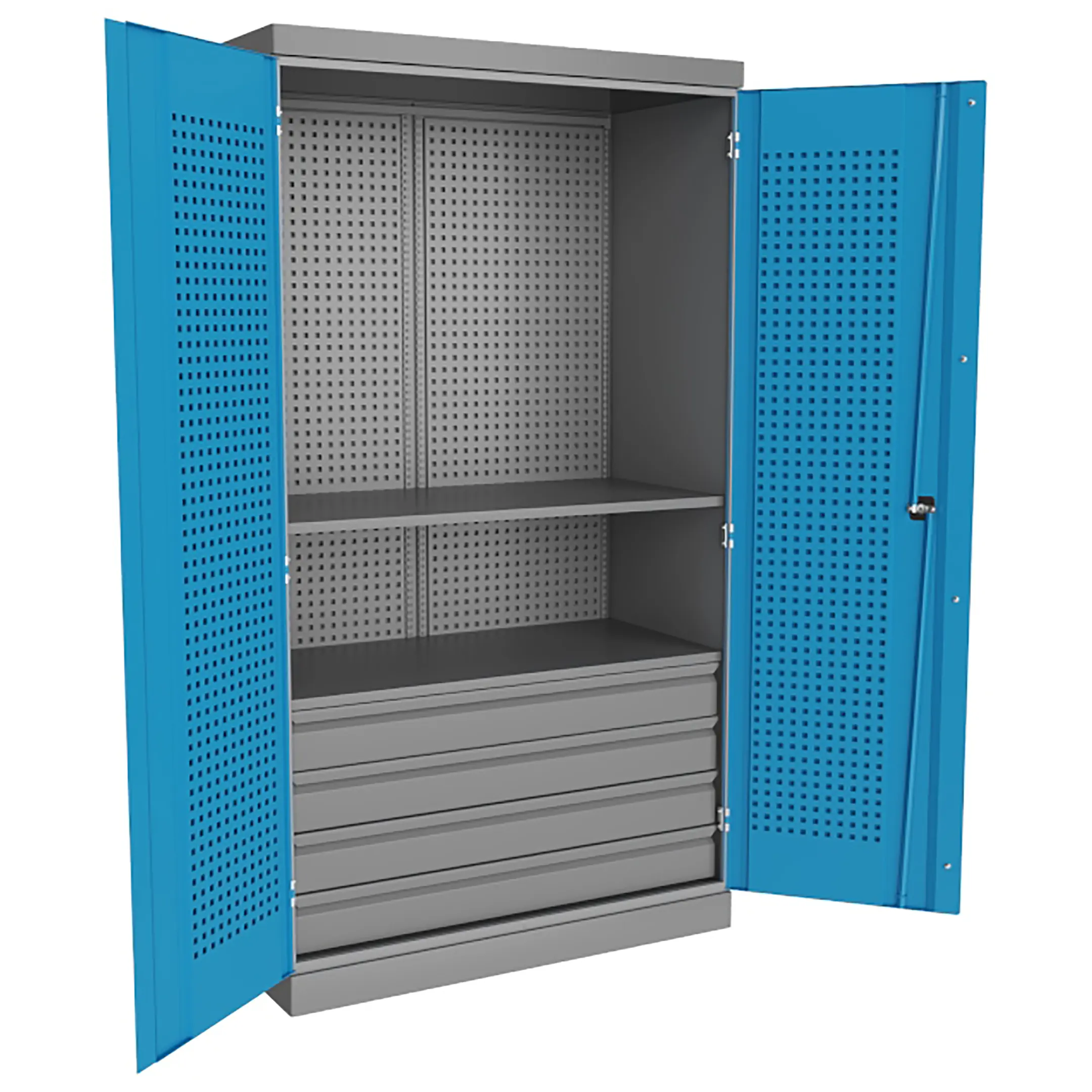 - Надежная защита инструментального парка — цельнометаллический корпус с запирающимися на общий замок дверями обеспечивает высокий уровень безопасности, защищая содержимое от краж и несанкционированного доступа. Конструкция также оберегает инструмент от агрессивных факторов цеховой среды: пыли, стружки, масел и влаги, продлевая его срок службы.