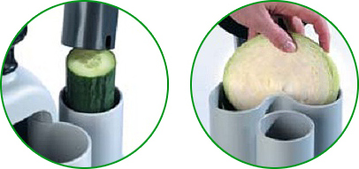 Насадка-овощерезка используется для нарезки сырых овощей, а также позволяет быстро приготовить разнообразные салаты, винегреты и выполнить любую форму нарезки, необходимую для приготовления супов, гарниров и сладких блюд. Овощерезка имеет 2 загрузочных отверстия: большая воронка площадью 104 см² для крупных овощей (картошка, свекла, капуста) и круглая воронка для овощей вытянутой формы диаметром 58 мм (огурцы, морковь, перец и т.д)