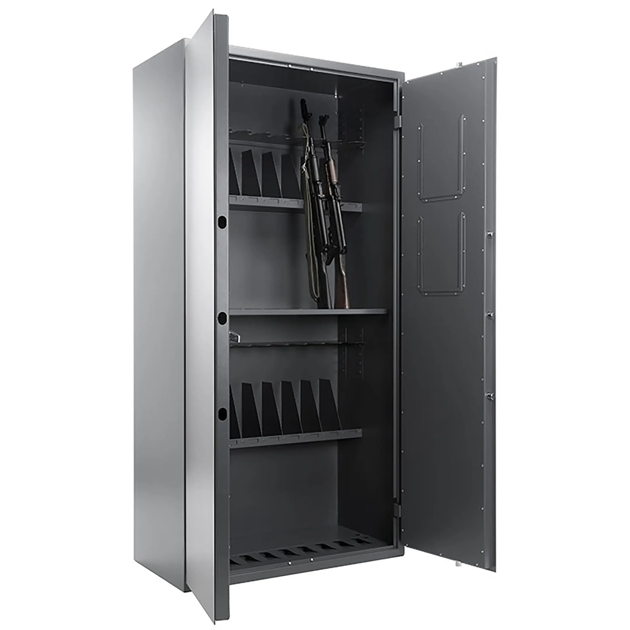 • оборудован 6-тью съемными полками (2 под приклад,2 под цевье,2 под магазины). Конструкция полок обеспечивает гарантированно надежное и устойчивое положение за счет собственного веса оружия;