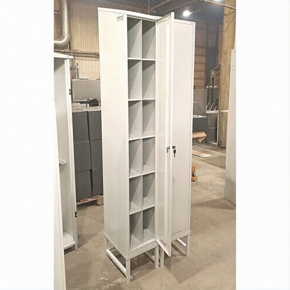 • Закрытый шкаф для хранения противогазов с дверью и подставкой окрашен порошковой краской, поверхность шагреневая.