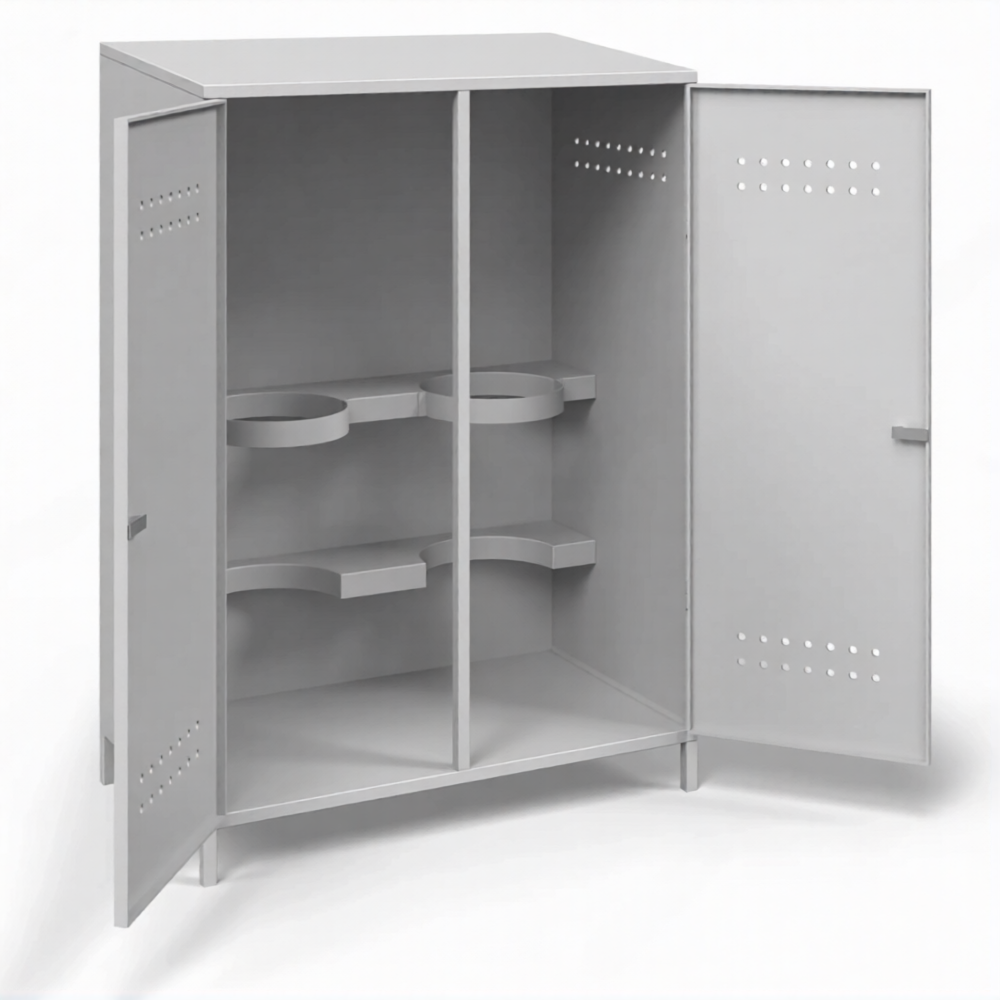 - Обеспечение высочайшего уровня пожарной безопасности — шкаф надежно изолирует два пропановых баллона от любых источников открытого огня, искр и теплового воздействия. Продуманная система вентиляции через перфорационные отверстия в нижней и верхней частях обеспечивает постоянный приток воздуха и безопасный отвод тяжелого газа в случае утечки, предотвращая создание взрывоопасной концентрации.