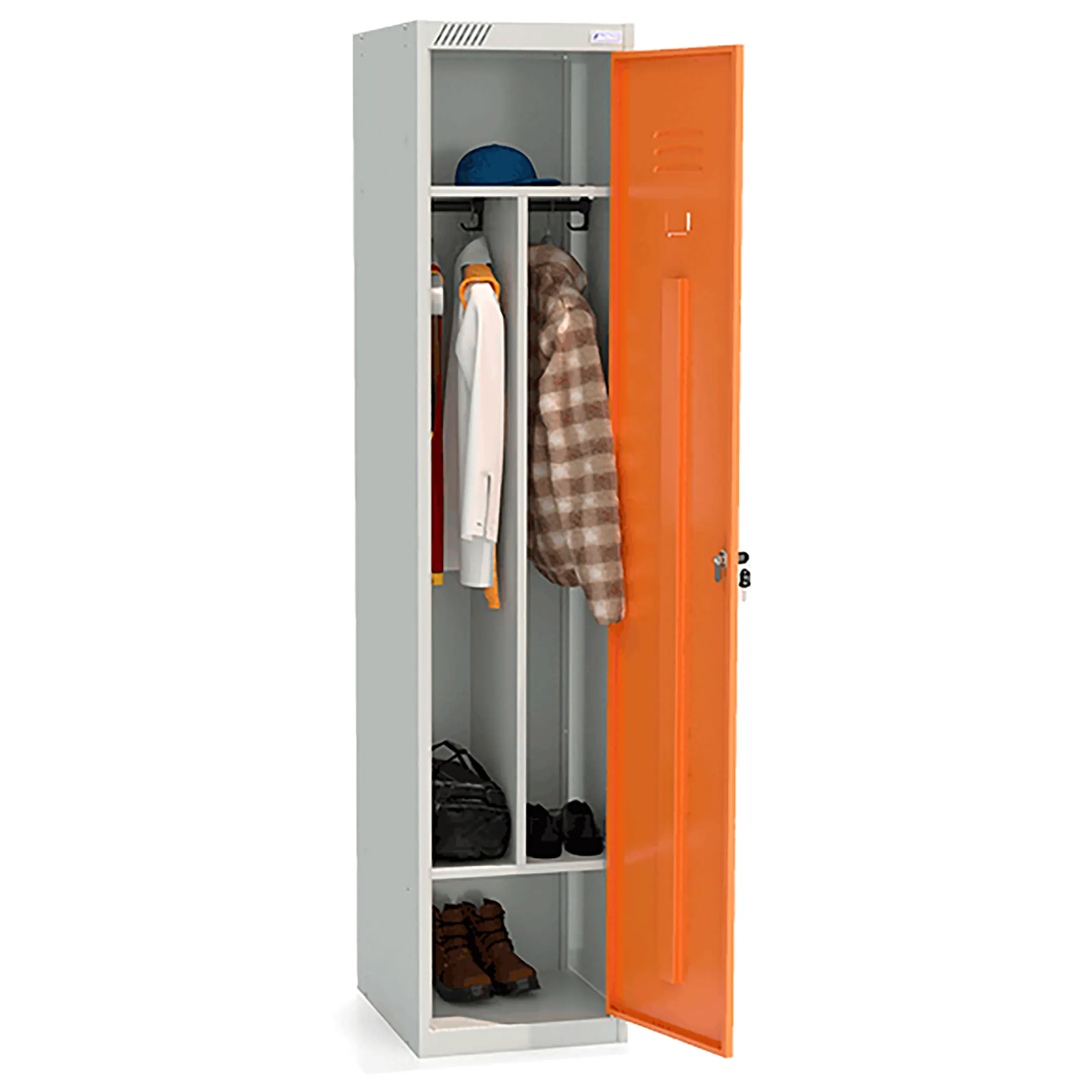 • комплектуется вертикальной перегородкой, общей полкой для головных уборов, полкой для обуви, 4 крючками, 2 перекладинами, 1 замком повышенной секретности;