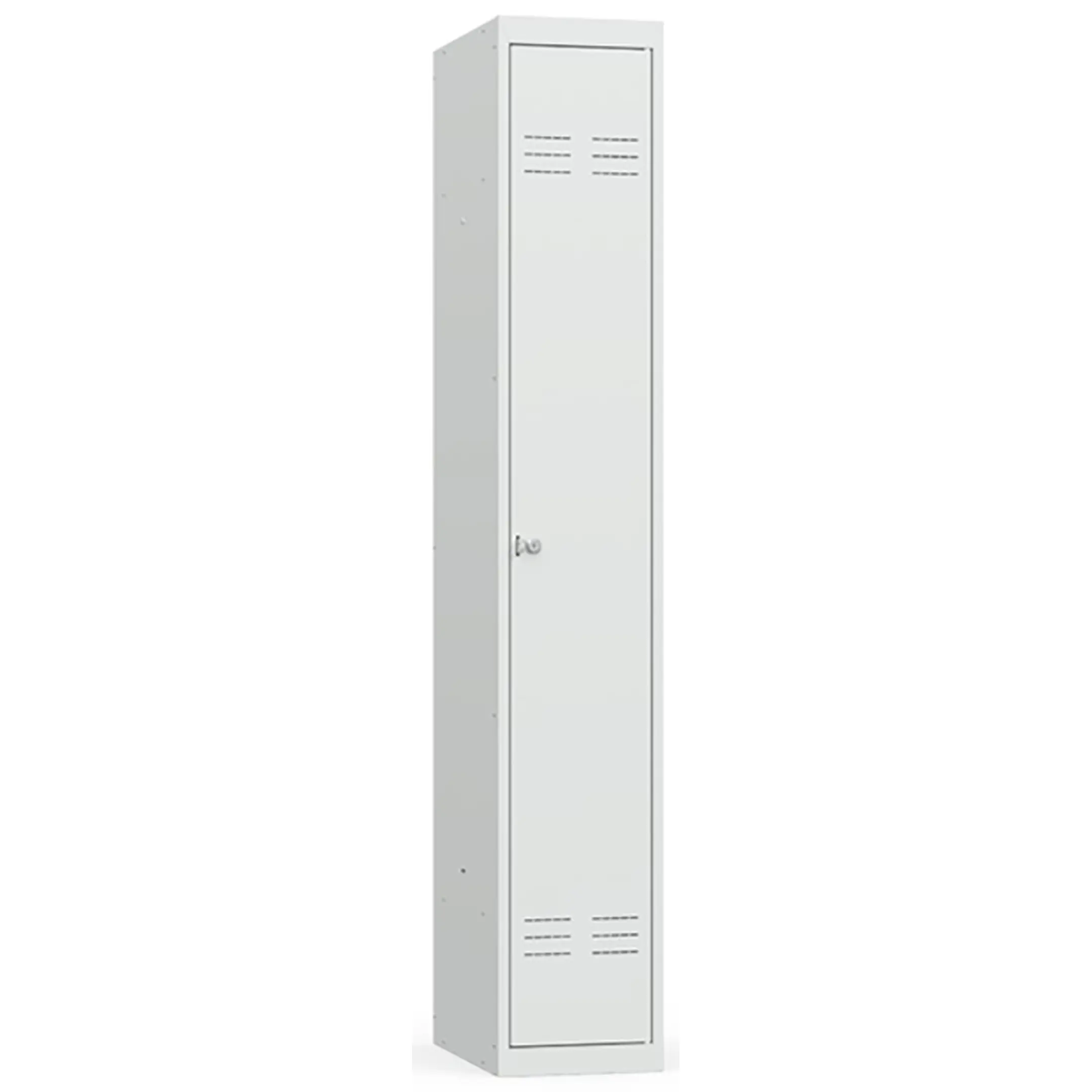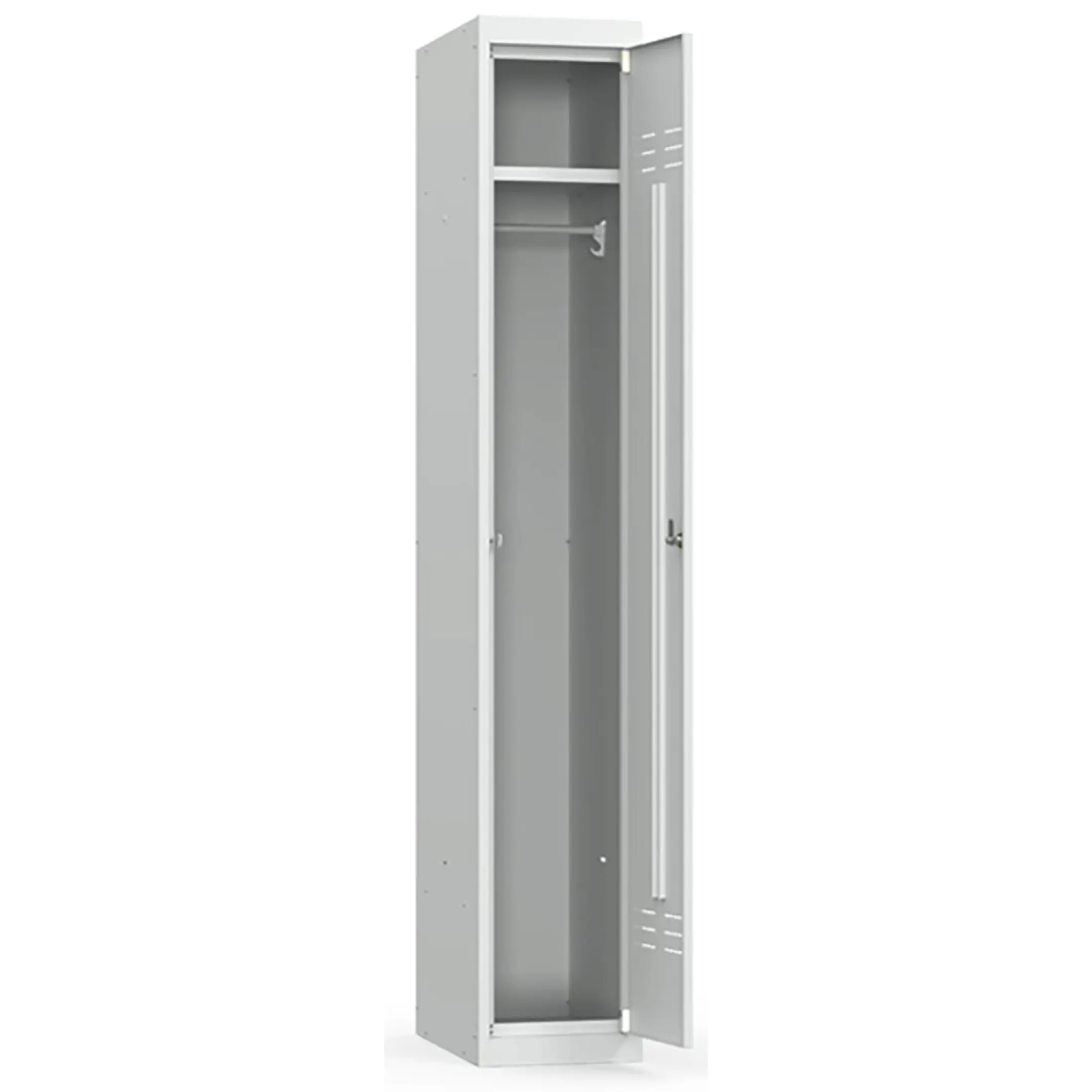 • Односекционный металлический шкаф для одежды имеет полную внутреннюю комплектацию: полку для головных уборов, пластиковые перекладины для вешалок и два крючка для одежды, проушина для навесных замков;