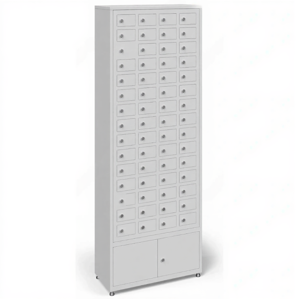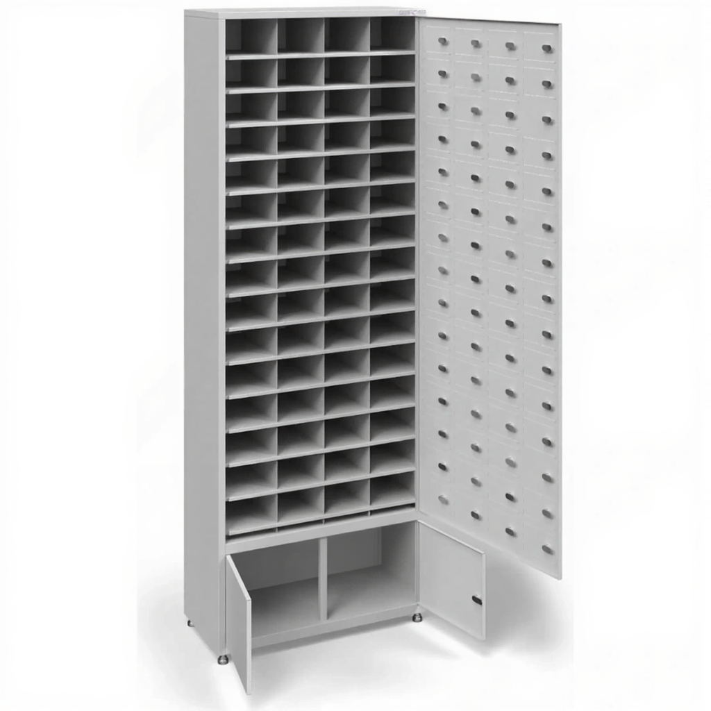 - Максимальная вместимость для крупных коллективов — шкаф предоставляет 58 индивидуальных запирающихся ячеек, что делает его идеальным для хранения устройств нескольких учебных классов, целой рабочей смены на производстве или участников масштабного тренинга. Это позволяет централизованно и упорядоченно решить проблему хранения, охватывая одновременно большую группу людей.