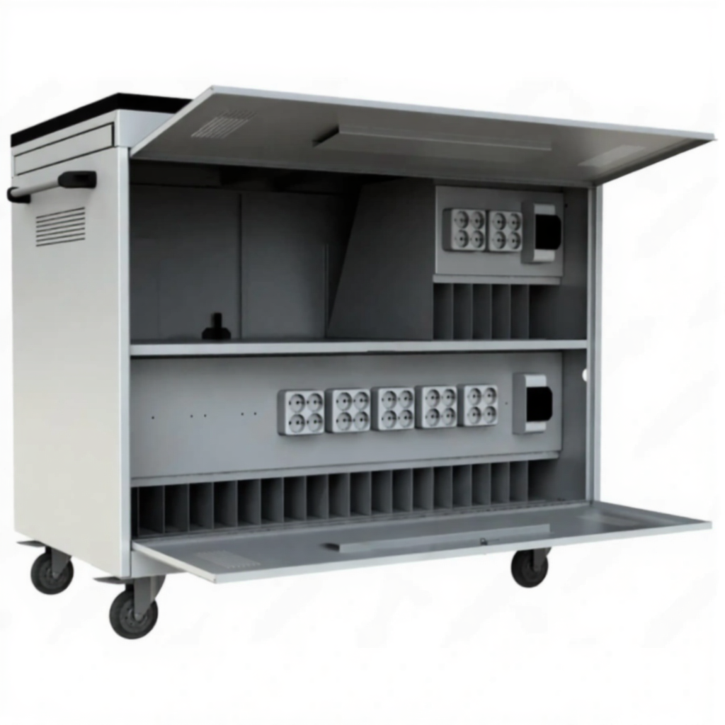 Тележка для хранения и зарядки 26 ноутбуков (17,3 дюймов) с электросхемой — это профессиональное и специализированное решение для организации мобильного класса, оснащенного ноутбуками увеличенного формата для ресурсоемких задач. Модель представляет собой мощную мобильную тележку с интегрированной интеллектуальной системой электропитания, рассчитанную на 26 ноутбуков с диагональю 17,3 дюйма. Она обеспечивает комплексную защиту, транспортировку и гарантированную зарядку всего парка техники, предназначенного для работы с графикой, программирования, инженерных расчетов и других специализированных дисциплин.